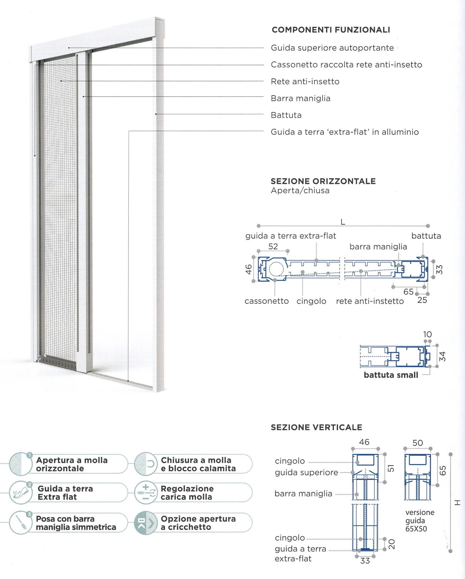 Nota: disponibile battuta “small” per ridurre l’ingombro lato chiusura. Componenti e ricambi coerenti con lo schema tecnico allegato.